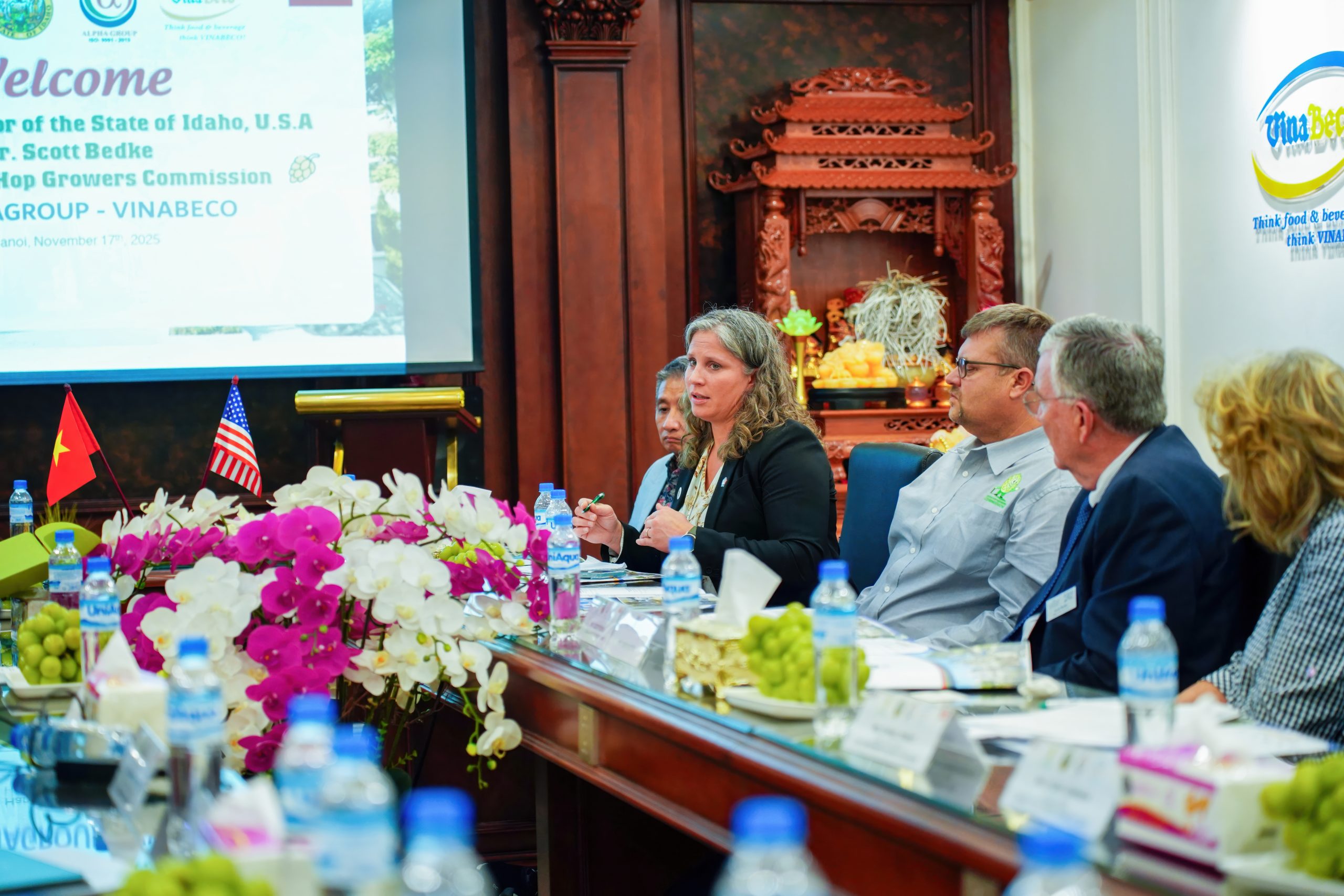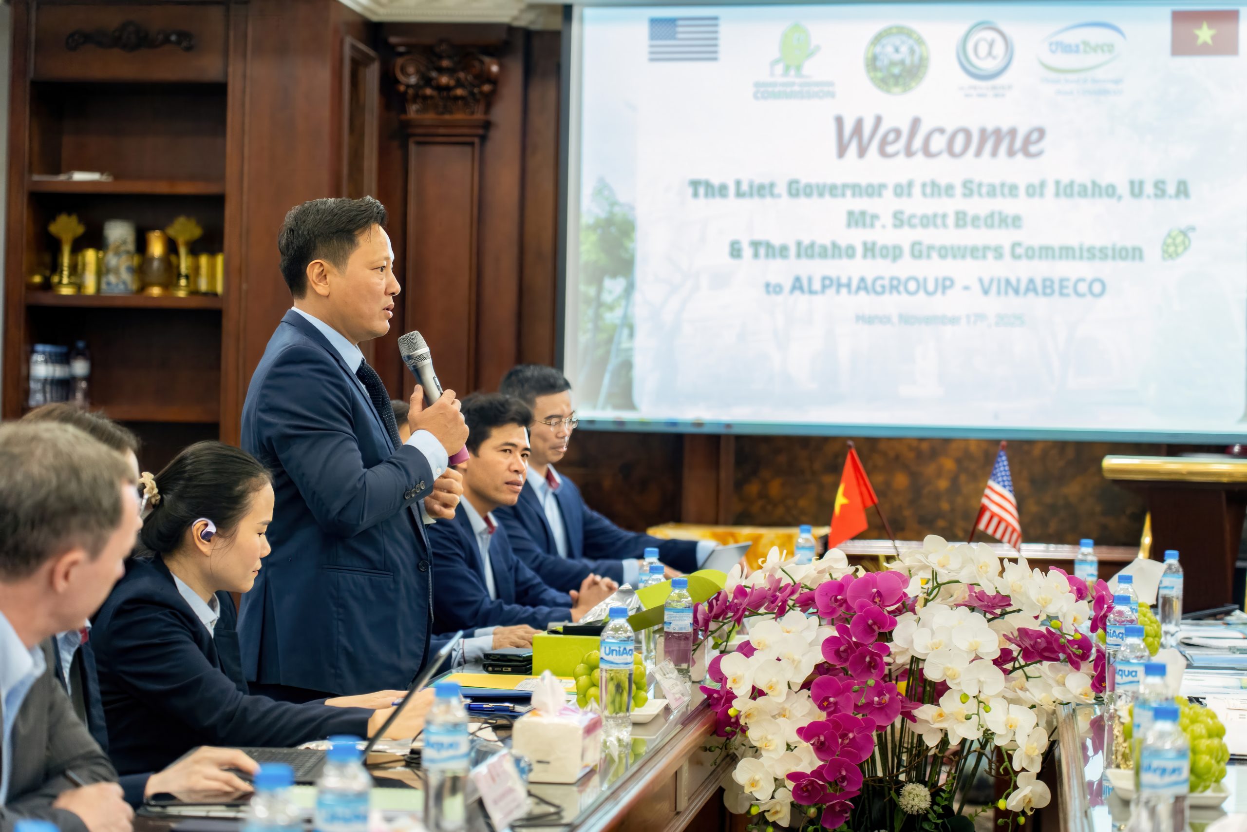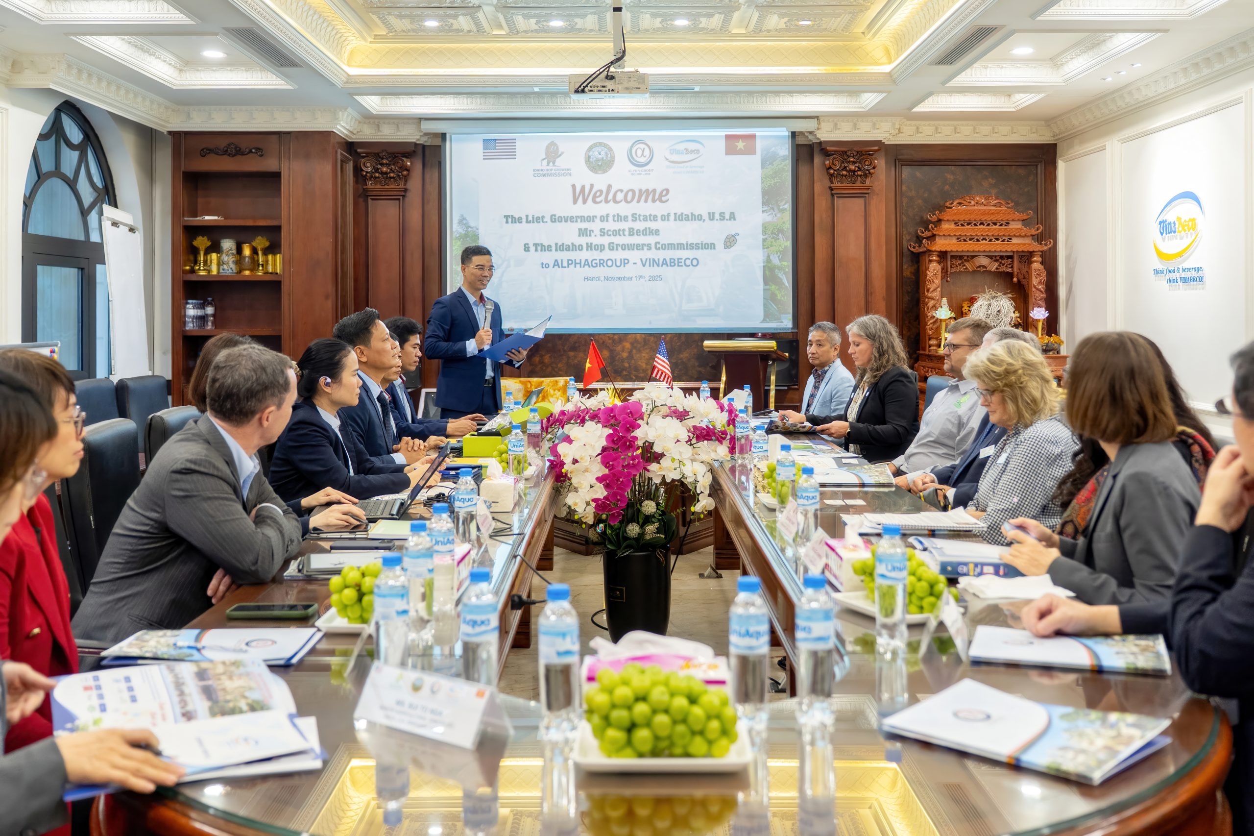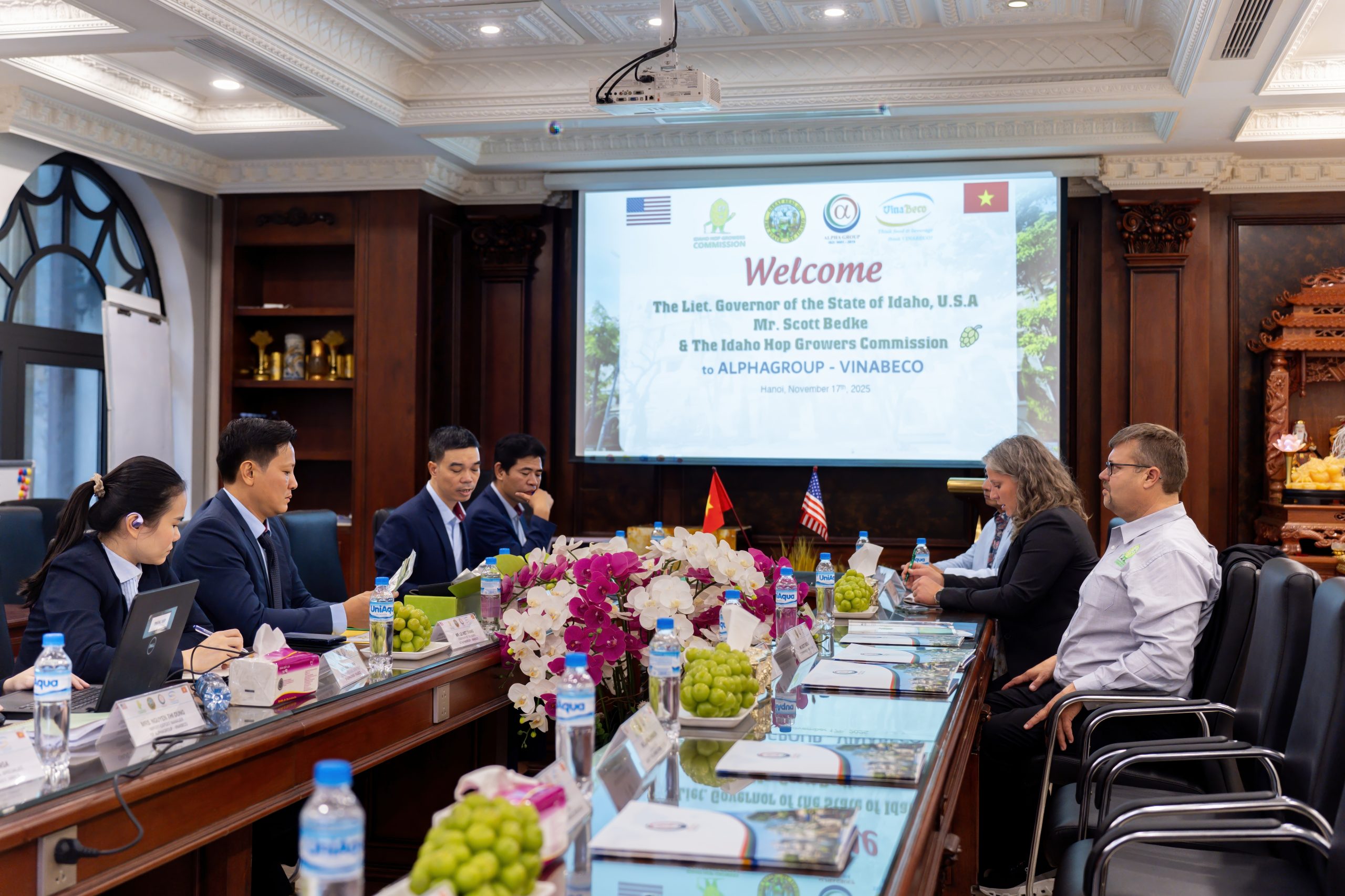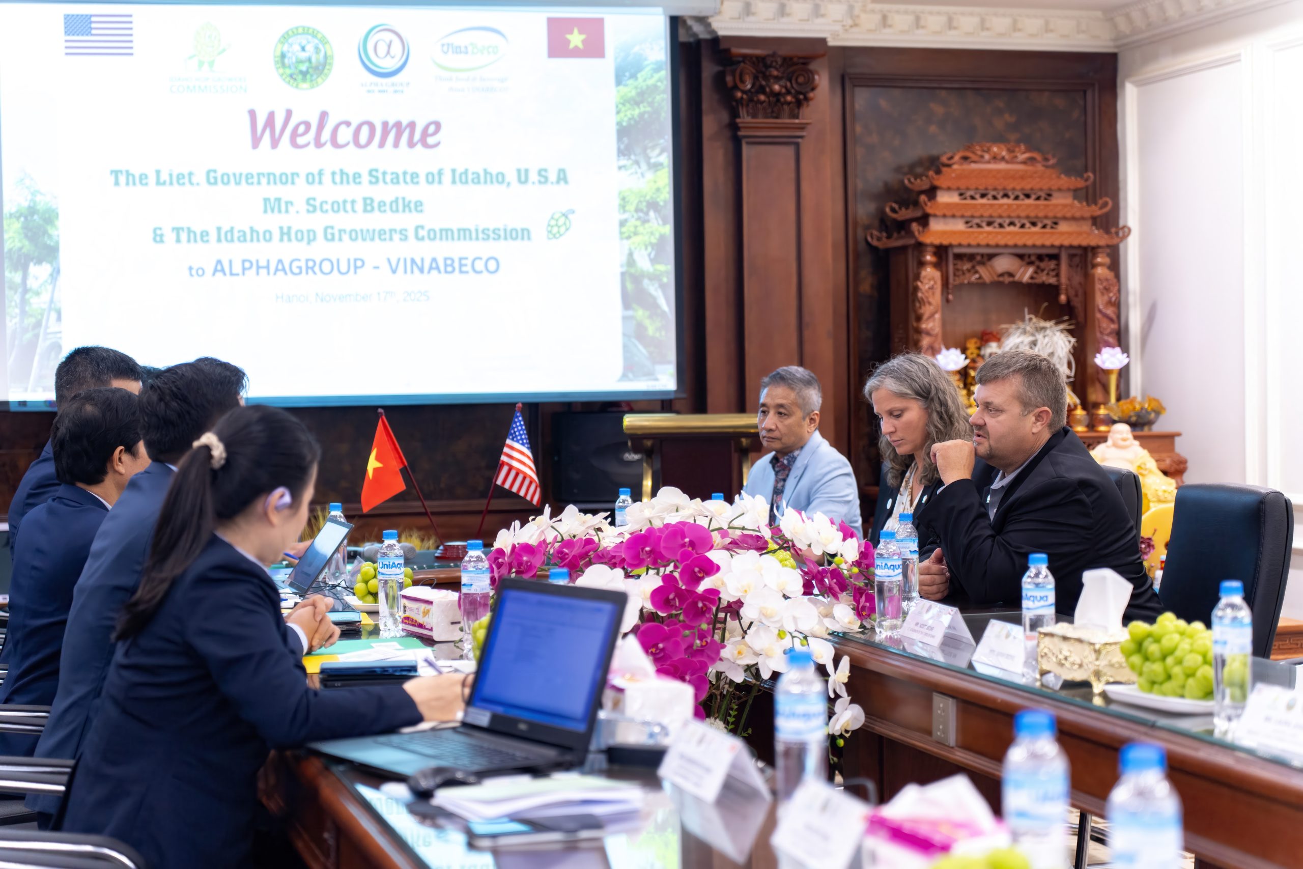 On the afternoon of November 17th, 2025, in Hanoi, AlphaGroup – VinaBeco was honored to welcome the high-level delegation from the State of Idaho (USA), led by Lieutenant Governor Scott Bedke, together with leaders of the Idaho Hop Growers Commission and representatives of Idaho’s agricultural development agencies. AlphaGroup – VinaBeco welcomed Lieutenant Governor Scott Bedke and his spouse, the Idaho delegation, and the leadership of the Idaho Hops Commission.
